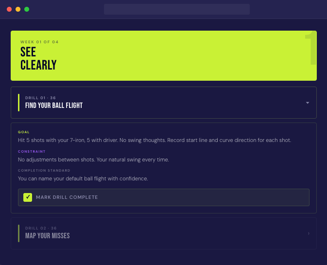 Every drill has a clear Goal, Constraint, and Completion standard. You always know what you're doing, why, and when you're done.